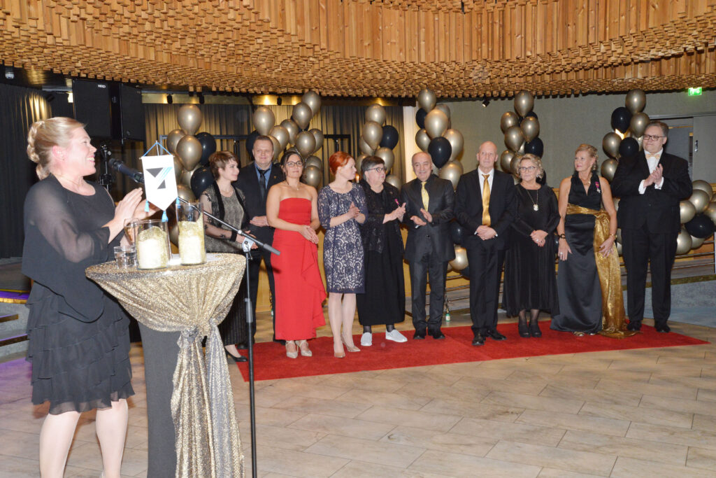 Juhlaa emännöinyt varapuheenjohtaja Tarja Koski-Sipilä (vas.) esitteli paikalla olleet Hyvinkään Yrittäjien hallituksen jäsenet juhlaväelle. Punaiselle matolle kokoontuivat Heidi Vanhatalo, Toni Rytkönen, Fehime Seifulla, Erja Yli-Kahila, Pirkko Suontausta, Valentin Nikolov, Jarmo Mikkonen, Sari Räikkä, Anne Rantalainen ja Juhani Saukkonen.