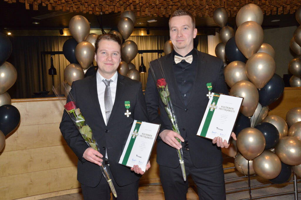 Muuttohaukat Oy:n yrittäjät Jani ja Totte Vivolin ottivat vastaan Suomen Yrittäjien myöntämät kultaiset yrittäjäristit.