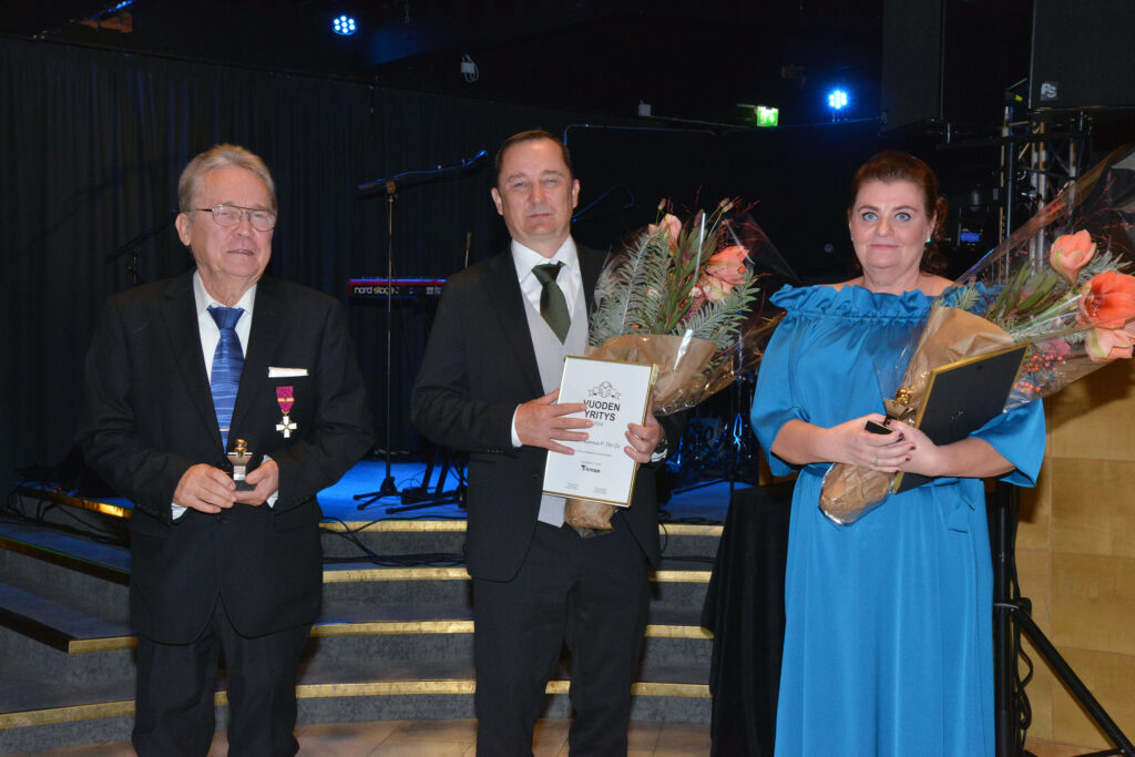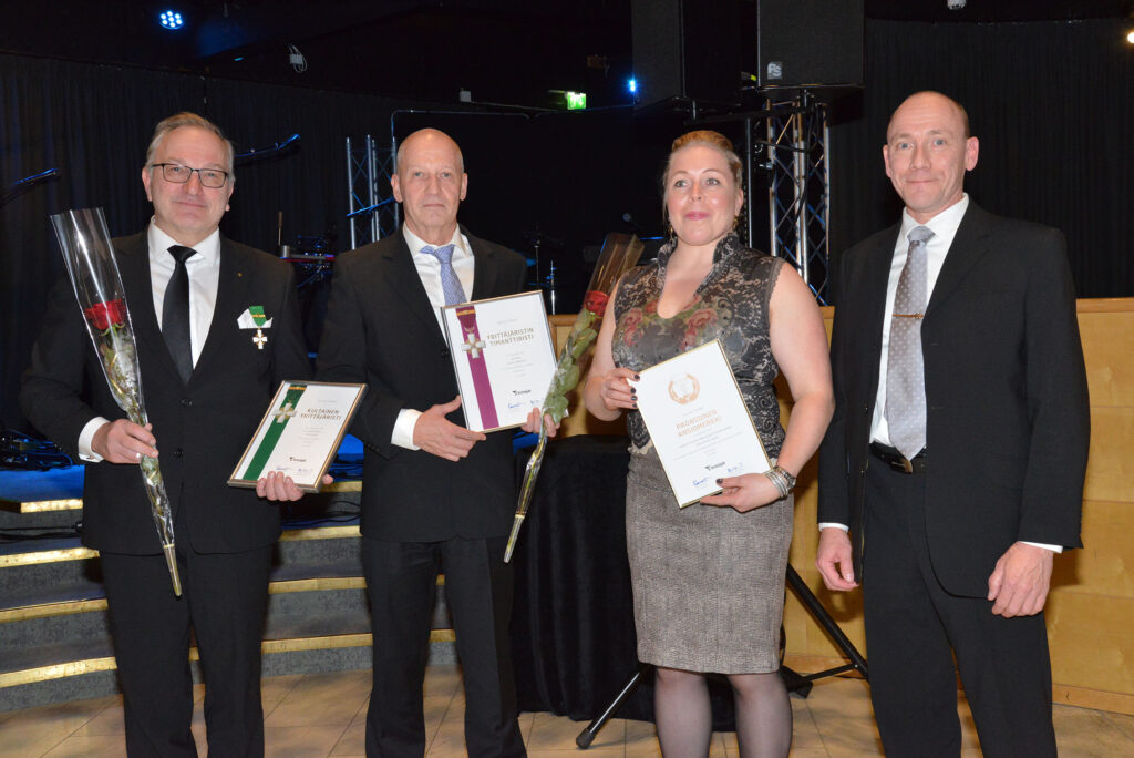 Uudenmaan Yrittäjien hallituksen puheenjohtaja Mikko Ahtiainen (oik.) jakoi Suomen Yrittäjien myöntämät ansiomerkit. Aki Junnila (vas.) sai kultaisen yrittäjäristin, Jarmo Mikkonen yrittäjäristin timanttiristin ja Tarja Koski-Sipilä pronssisen ansiomerkin.