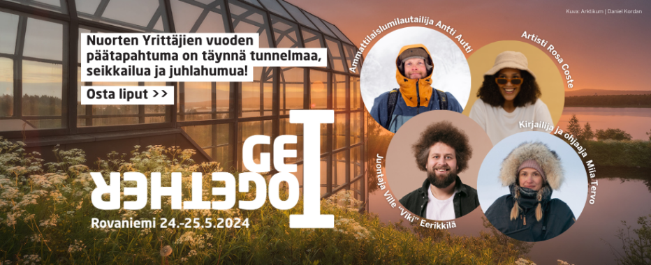 - Viimeisimpänä, mutta ei vähäisimpänä. Ei tarvitse olla tietyn ikäinen, että saa osallistua GetTogetheriin. Tapahtuma on Nuorten Yrittäjien järjestämä, mutta avoin kaikille yrittäjille ja yrittäjyydestä kiinnostuneille. Osallistujia yhdistää kuitenkin tietynlainen nuorekas asenne ja erityinen hyvä henki, jollaista en ole missään muussa tapahtumassa kokenut.