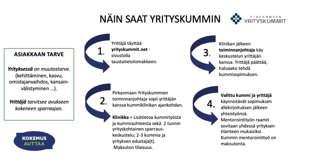 Yrittäjän kannattaa käydä kurkkimassa lisätietoa netistä osoitteessa yrityskummit.net. Sieltä löytyy lisätietoa. Niin yrittäjille kuin mahdollisille tuleville kummeillekin.