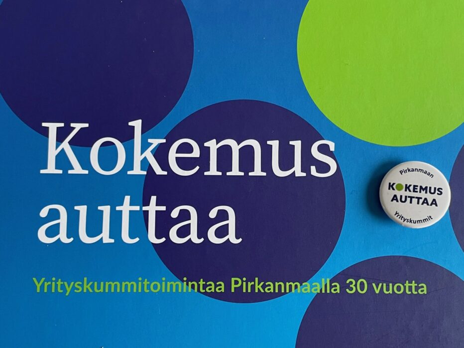 voi kyllä yrityskummin tunnistaa pienestä pyöreästä rintanapista, jossa lukee ”Kokemus auttaa. Pirkanmaan Yrityskummit”.