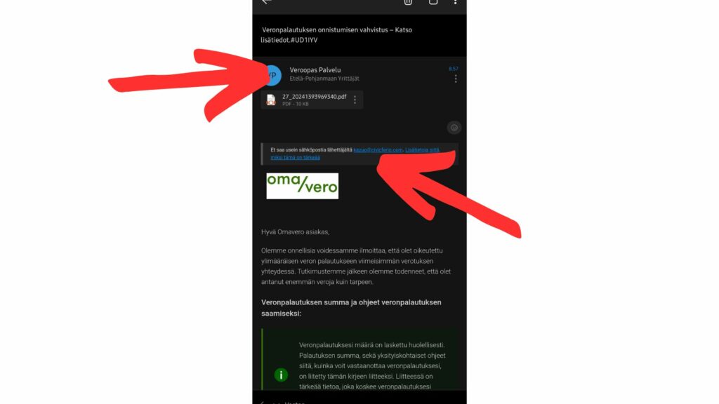 Tupsahti meille tänne Etelä-Pohjanmaan Yrittäjillekin sähköposti otsikolla ”Veronpalautuksen onnistumisen vahvistus” ja olipa viestiin nätisti liitetty Omaveron logokin. Viestin sisältö oli kirjoitettu uskottavasti, mutta lähettäjän nimenä oli ”Veroopas Palvelu” ja lähettäjän sähköpostiosoitteena kazuo@civicferio.com. Näistä on hyvä tunnistaa, että mahtaakohan lähettäjä olla aivan se, miksi itseään väittää.