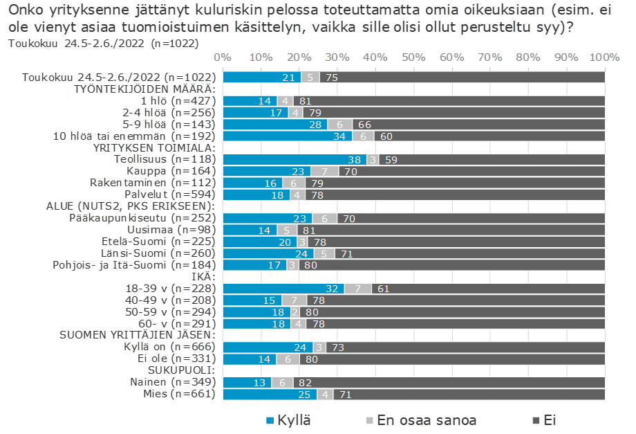 Suomen Yrittäjien touko-kesäkuussa 2022 teettämän kyselyn mukaan noin 20 prosentissa tapauksista yrittäjä tai yritys ei vie asiaansa oikeuden ratkaistavaksi kuluriskin pelossa. Kyselystä ilmenee, että mitä isommasta yrityksestä on kyse, sitä useammin yrityksellä olisi tarve saattaa asiansa oikeuden ratkaistavaksi. Yli 10 henkilöä työllistävien yritysten osalta kuluriskin uhka on estänyt jo 34 prosentissa tapauksista viemästä asiaansa tuomioistuimeen. Selvityksemme perusteella voidaankin puhua jo merkittävistä luvuista.