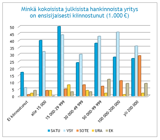 Jäsenistömme pitää osittamisvelvoitetta hyvin merkityksellisenä. Samalla on kuitenkin niin, että pk-yritykset ovat pääasiassa kiinnostuneita pienemmistä, EU-kynnysarvot alittavista hankinnoista: Kuva TEM-selvityksestä 54/2015, Pk-yritysten kokemukset ja näkemykset julkisista hankinnoista: