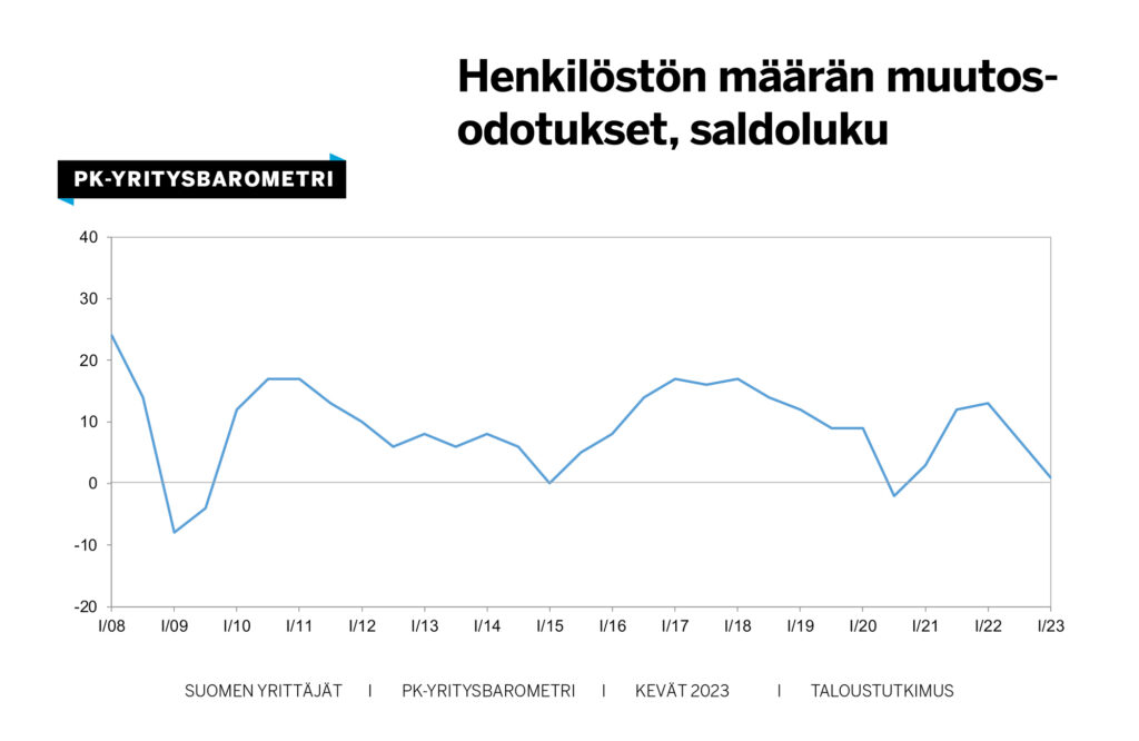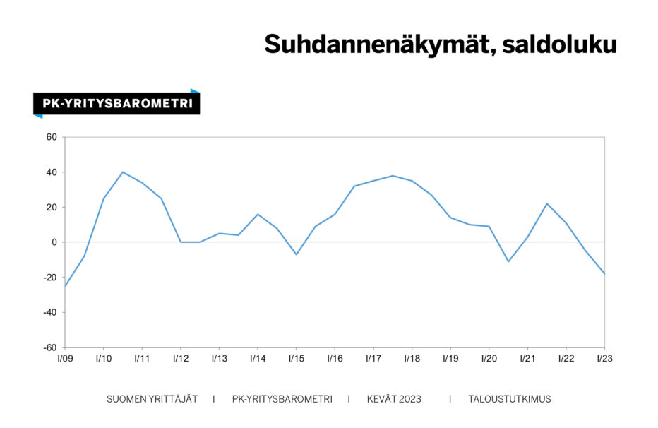 Kevään 2023 pk-yritysbarometrissa yritysten suhdanneodotuksia ja investointiaikeita kuvaavat saldoluvut jatkoivat laskuaan. Silti puolet pk-yrityksistä arvioi suhdanteiden yhä pysyvän ennallaan.