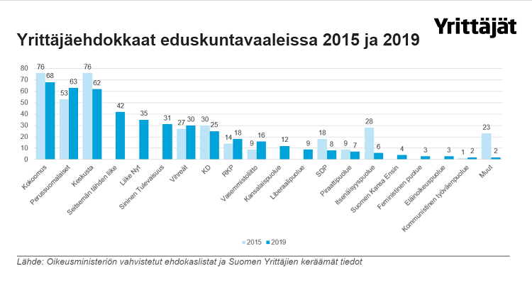 Suurimmat yrittäjäpuolueet ovat kokoomus (68 ehdokasta), perussuomalaiset (63) ja keskusta (62).