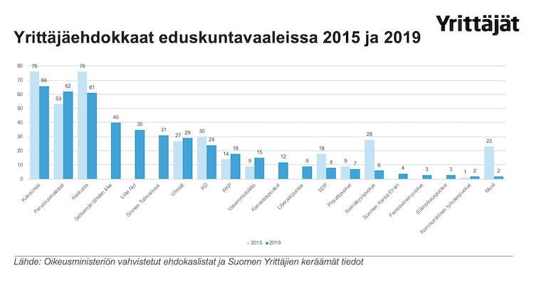 Suurimmat yrittäjäpuolueet ovat kokoomus (66 ehdokasta), perussuomalaiset (62) ja keskusta (61).