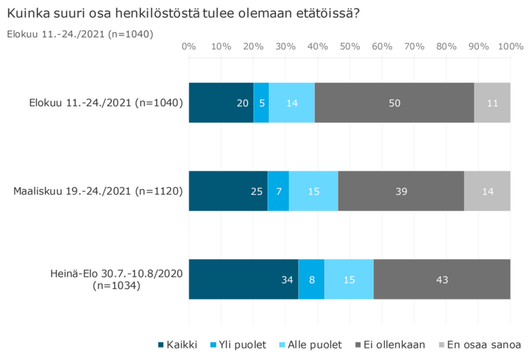 Yrittäjägallup myös osoittaa, että yhä pienempi osa henkilöstöstä jää etätöihin. Maaliskuussa joka neljäs yritys kertoi, että etätöihin jää koko henkilöstö. Nyt osuus oli joka viides. Maaliskuussa 39 prosenttia ei ollut jäämässä ollenkaan, nyt puolet.
