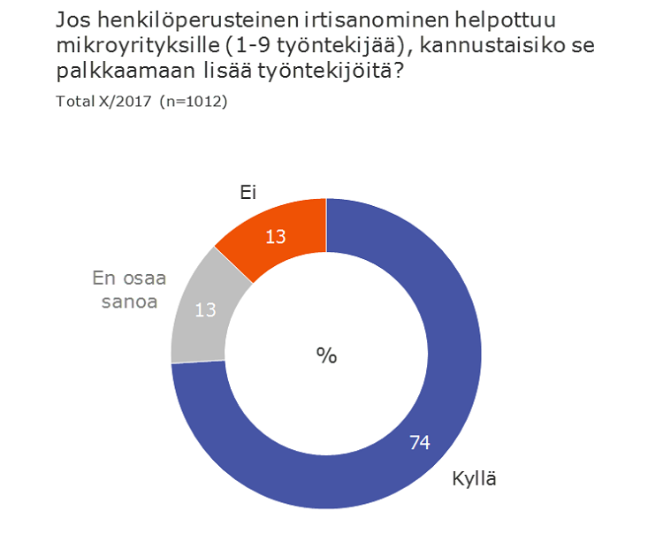 Suomen Yrittäjät kysyi asiasta pk-yrittäjiltä viime syksynä. Kolme neljästä vastaajasta kertoi, että henkilöperusteisen irtisanomisen helpottaminen kannustaisi mikroyrityksiä palkkaamaan lisää työntekijöitä. Kyselyn teki TNS Kantar. Syys-lokakuussa 2017 tehtyyn Yrittäjägallupiin vastasi yli tuhat pk-yritystä.