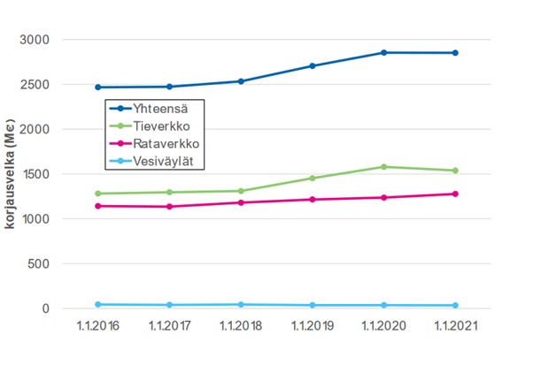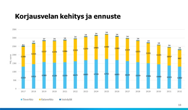 Liikenteen rahoituksen leikkaaminen nopeuttaisi entisestään Suomen tiestön ja rataverkon rapautumista. Maantie- ja rautatieverkon korjausvelka on kasvanut viime vuosina Sipilän ja Marinin hallitusten väylänpidon lisäpanostuksista huolimatta viidessä vuodessa 2,5 miljardista lähemmäs kolmeen miljardiin euroon. Väyläviraston ennusteen mukaan kasvu jatkuu. Korjausvelalla tarkoitetaan rahasummaa, joka tarvittaisiin väylien saattamiseksi nykytarpeita vastaavaan hyvään kuntoon.