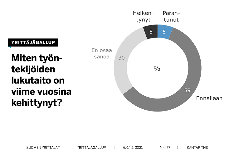 Yrittäjiltä kysyttiin, miten työntekijöiden lukutaito on viime vuosina kehittynyt. Valtaosa vastasi sen pysyneen ennallaan. Lähes yhtä moni arveli työntekijöiden lukutaidon parantuneen (6 %) kuin heikentyneen (5 %). Alakohtaiset erot ovat vähäisiä. 30 prosenttia työnantajista ei osannut arvioida työntekijöidensä lukutaidon kehitystä.