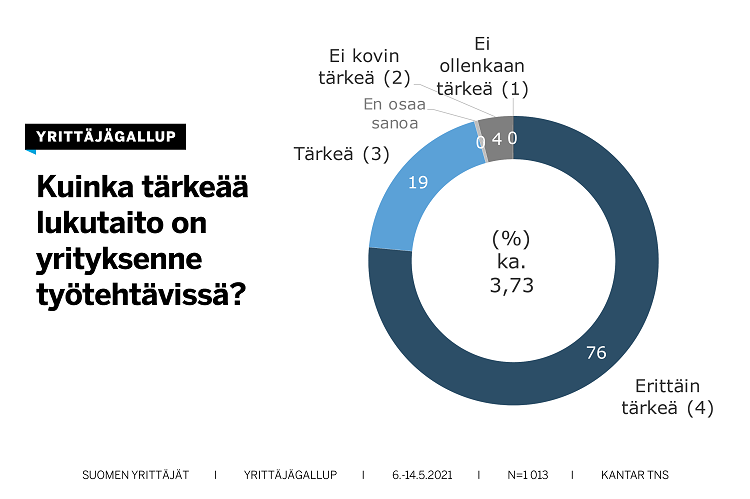 Yrittäjistä 76 prosenttia pitää lukutaitoa erittäin tärkeänä ja 19 tärkeänä yrityksissään. Neljä prosenttia arvioi, ettei se ole kovin tärkeä, Yrittäjägallup kertoo. – Lukutaitoon pitää panostaa. Se on työelämän perusosaamista, joka ehkäisee syrjäytymistä. On tärkeä kuitenkin noteerata, että on myös työtehtäviä, joissa lukutaidon merkitys on vähäinen, Suomen Yrittäjien toimitusjohtaja Mikael Pentikäinen arvioi.
