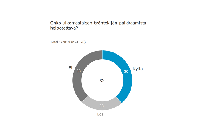 39 prosenttia suomalaisista siis helpottaisi ulkomaalaisten työntekijöiden palkkaamista. Päinvastaista mieltä on 38 prosenttia ja 23 prosenttia ei osaa sanoa. Tiedot käyvät ilmi Kantar TNS:n Suomen Yrittäjien pyynnöstä tekemästä mielipidetiedustelusta. Siihen vastasi tammikuun lopussa 1078 suomalaista.