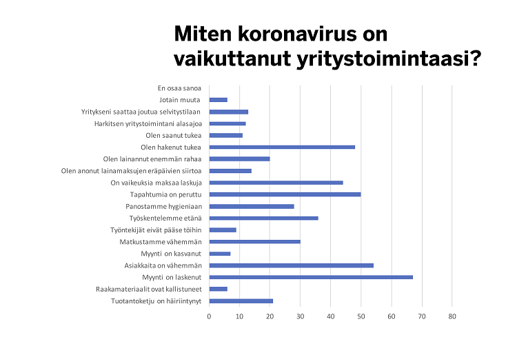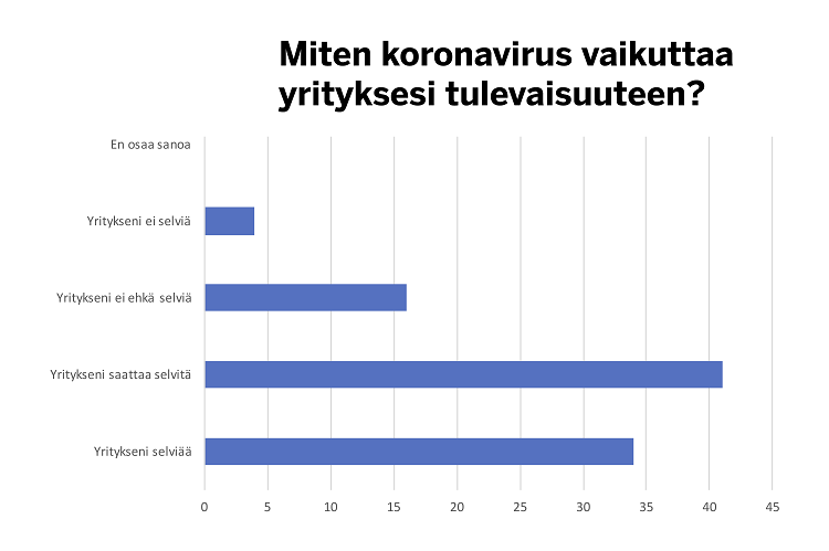Kyselyyn vastanneista yrittäjistä 34 prosentilla myynti oli puolittunut, 21 prosentilla myynti oli laskenut 10–30 prosenttia ja 20 prosentilla 30–50 prosenttia. 20 prosentilla myynti oli lakannut kokonaan. Ainoastaan seitsemän prosenttia vastaajista uskoi liikevaihtonsa kasvavan seuraavan kahden viikon sisään.