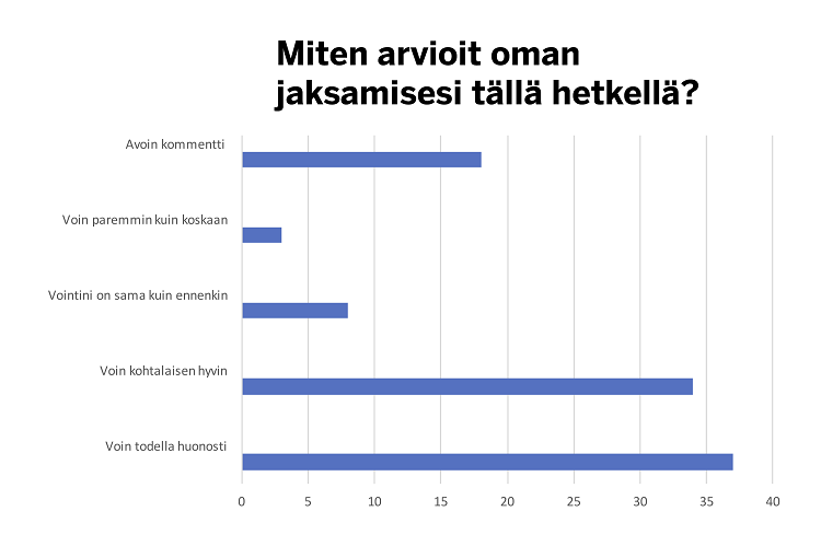 - 38 prosenttia vastaajista voi kohtalaisen hyvin, mutta 38 prosenttia todella huonosti.