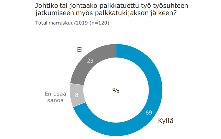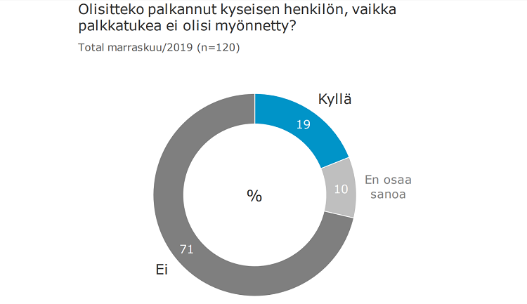 Kiinnostavaa vastauksissa on myös se, että palkkatukea käyttäneistä yrityksistä jopa 69 prosenttia vastasi, että työntekijän työ jatkuu myös palkkatukijakson jälkeen.