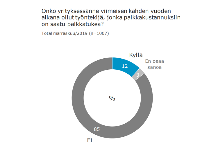 Suomen Yrittäjät pyysi Kantar TNS:ää selvittämään palkkatuen tilannetta. Kyselyyn vastasi 1007 yrittäjää. Vain 12 prosentissa suomalaisyrityksissä on viimeksi kuluneet kahden vuoden aikana ollut työntekijä, jonka palkkaamiseen saa palkkatukea. Eniten heitä oli teollisuusyrityksissä (23 %) ja vähiten palvelualalla (9 %).