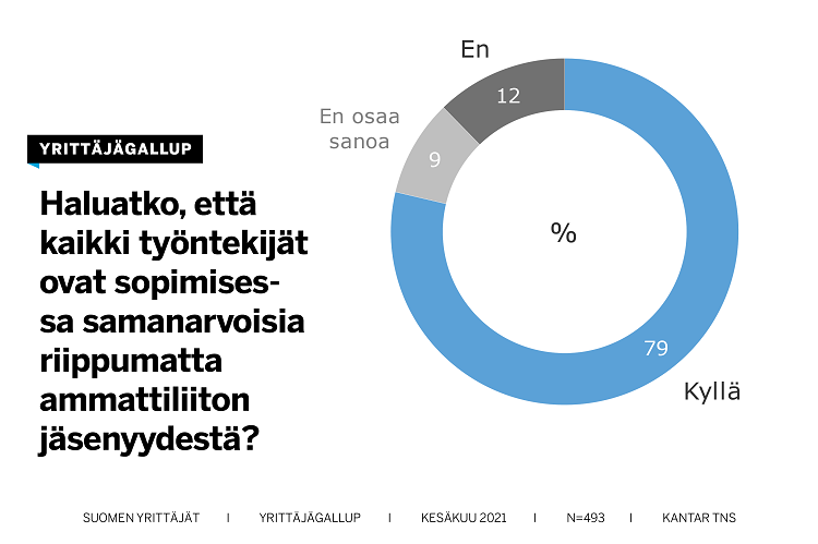 Suuri enemmistö (79 %) haluaa, että kaikki työntekijät ovat sopimisessa samanarvoisia riippumatta ammattiliiton jäsenyydestä. Eri mieltä asiasta on vain 12 % vastaajista.