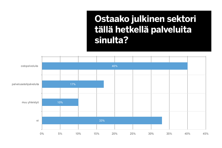 67 prosenttia vastaajista kertoo myyvänsä palveluita julkiselle sektorille: 40 prosenttia ostopalveluina, 17 prosenttia palvelusetelillä ja 10 prosenttia muuna yhteistyönä.