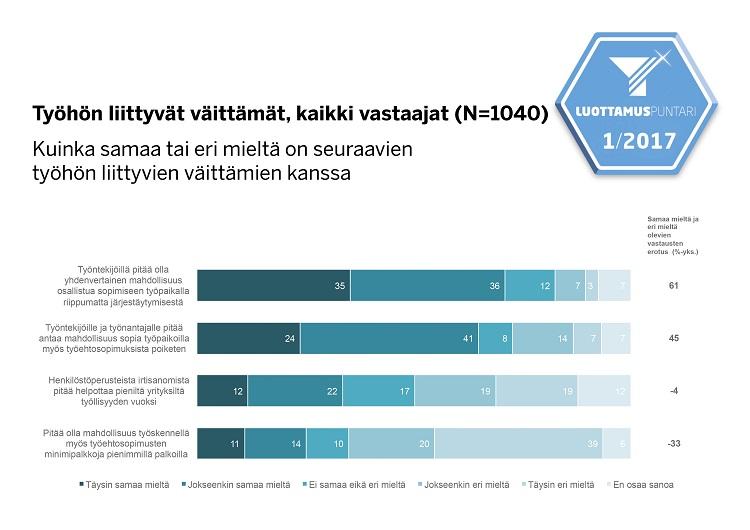 Tieto käy ilmi Kantar TNS:n tekemästä Luottamuspuntari-tutkimuksesta, johon vastasi 1040 suomalaista tammi-helmikuun vaihteessa. 24 prosenttia vastaaista oli täysin samaa mieltä ja 41 prosenttia jokseenkin samaa mieltä väitteen ”työntekijöille ja työnantajalle pitää antaa mahdollisuus sopia työpaikoilla myös työehtosopimuksista poiketen” kanssa. Vain viidennes vastaajista oli jokseenkin tai täysin eri mieltä. Tutkimuksen teetti Suomen Yrittäjien Yrittäjäsanomat.