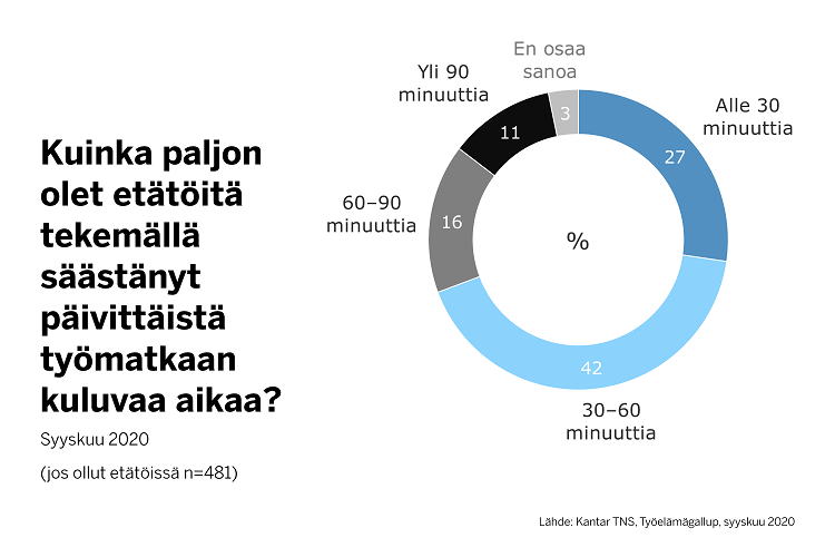 42 prosenttia etätyötä tehneistä vastaajista kertoo säästäneensä työmatka-aikaa puolesta tunnista tuntiin, 16 prosenttia tunnista puoleentoista ja 11 prosenttia yli puolitoista tuntia.