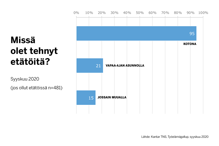 95 prosenttia etätöitä tehneistä teki etätöitä kotona, 21 prosenttia jossain muualla ja 15 prosenttia vapaa-ajan asunnolla. Kysymykseen sai valita useita vaihtoehtoja. Hieman yllättäen eniten vapaa-ajan asunnolla työskentelivät alle kolmekymppiset työlliset.