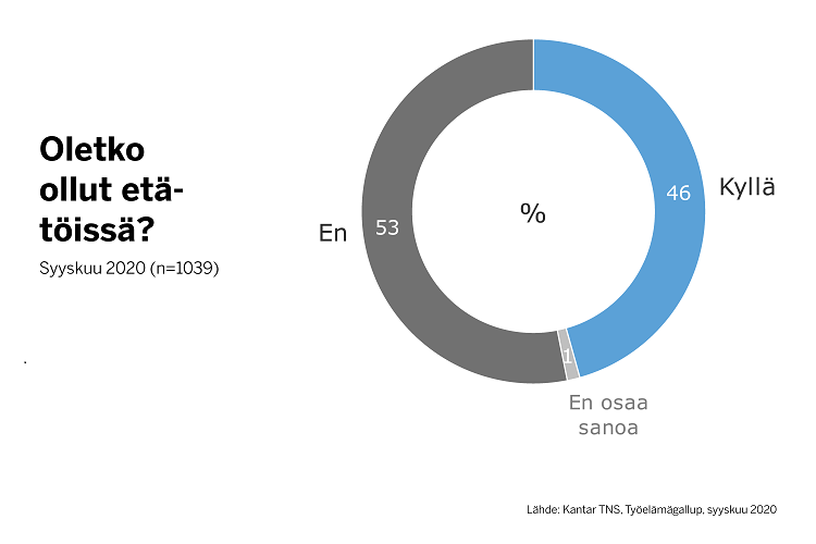 46 prosenttia vastaajista kertoo tehneensä etätöitä. Puolet etätyötä tehneistä vastaajista kertoo työtyytyväisyyden lisääntyneen selvästi tai jonkin verran. Työtyytyväisyys oli vähentynyt 18 prosentilla vastaajista.