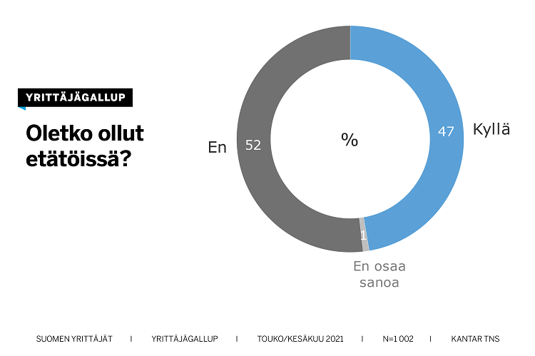 Etätyön suosio vain kasvaa suomalaisessa työelämässä, Työelämägallup kertoo. Työelämässä olevista 74 prosenttia haluaisi tehdä etätöitä. Tammikuussa osuus oli 72 prosenttia. – Viesti on selvä: suomalaiset haluavat tehdä laajalti etätöitä. Siihen kannattaa antaa mahdollisuus, jos se vain työtehtävään sopii, Suomen Yrittäjien toimitusjohtaja Mikael Pentikäinen kommentoi.