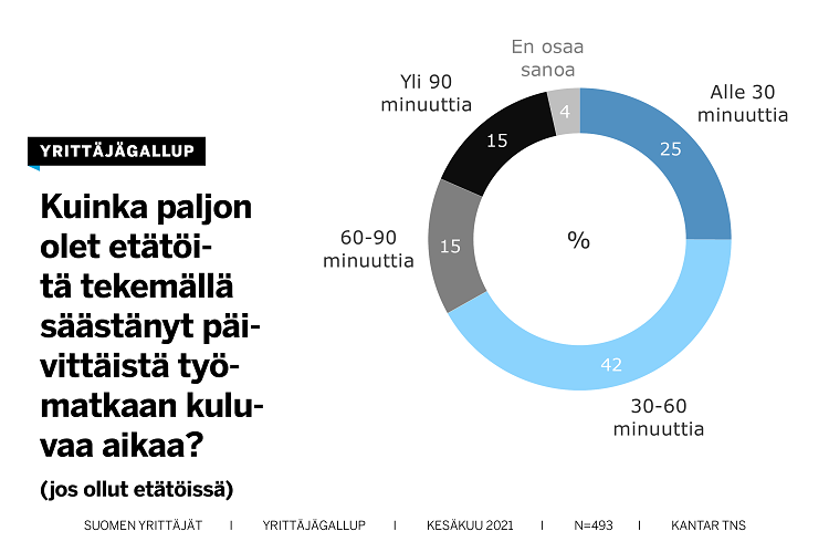 Etätyön yleistyessä on säästynyt valtavasti työmatka-aikaa. Jopa 30 prosenttia etätyötä tehneistä on säästänyt yli tunnin päivässä. 42 prosenttia on säästänyt 30–60 minuuttia päivässä.