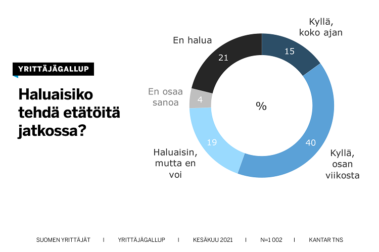 15 prosenttia haluaisi olla koko ajan etätöissä ja 40 prosenttia osan viikosta. 19 prosenttia haluaisi tehdä etätöitä, mutta ei pysty työtehtävän vuoksi.