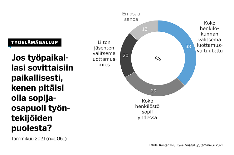 Jos työpaikalla sovittaisiin paikallisesti, suosituin työllisten puolesta sopija on koko henkilökunnan valitsema luottamusvaltuutettu (38 %). Toiseksi suosituin vaihtoehto olisi, että koko henkilöstö olisi yhdessä sopimassa (29 %). Liiton jäsenten valitsemaa luottamusmiestä kannattaisi 20 prosenttia työllisistä. – Pitää rakentaa malli, jossa sopiminen on laajalti mahdollista myös koko henkilöstöä edustavan luottamusvaltuutetun kanssa. Luottamusvaltuutettu on merkittävästi luottamusmiestä halutumpi sopimisen osapuoli työpaikoilla, työmarkkinajohtaja Janne Makkula sanoo.