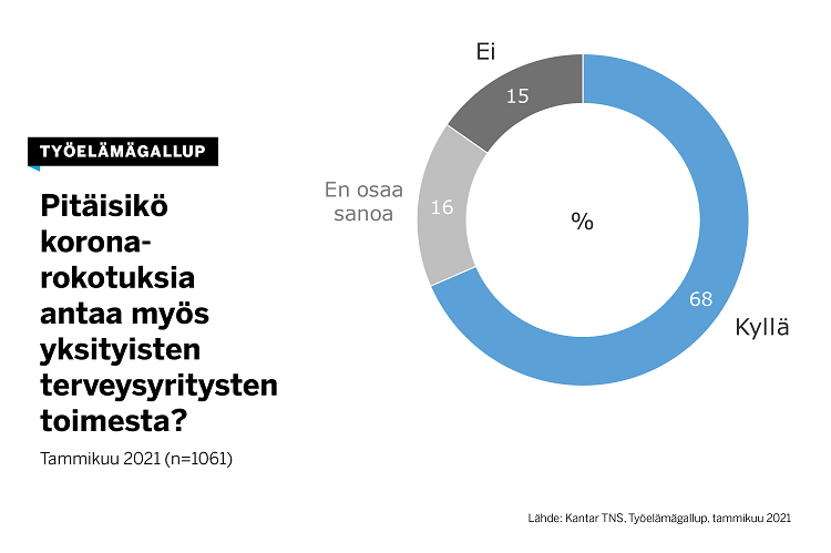 Kantar TNS kysyi Suomen Yrittäjien toimeksiannosta työelämässä olevilta heidän mielipiteitään koronarokotuksista. 68 prosenttia vastaajista on sitä mieltä, että rokotuksia antamaan pitää ottaa myös yksityiset terveysyritykset. Tätä vastustaa vain 15 prosenttia vastaajista. Vahvimmin yksityisten yritysten mukaan ottamista vaativat yli 45-vuotiaat.