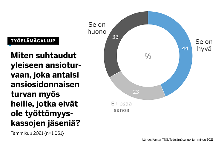 Työllisistä 44 prosenttia pitää hyvänä yleistä ansioturvaa, joka antaisi ansiosidonnaisen turvan myös niille, jotka eivät ole työttömyyskassojen jäseniä. Kolmannes pitää ideaa huonona ja 23 prosenttia ei osaa arvioida ehdotusta.