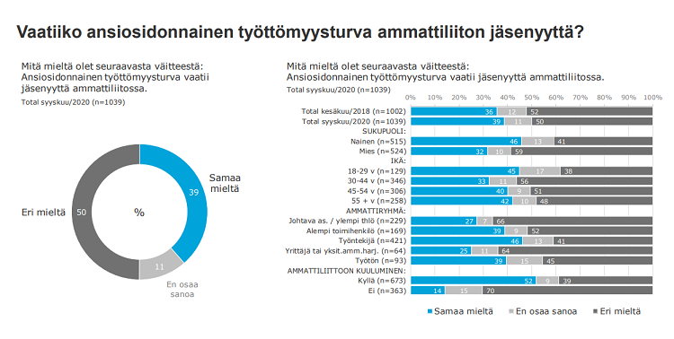 Vain puolet vastaajista tiesi, että ansiosidonnaisen työttömyysturvan saaminen ja ammattiliiton jäsenyys eivät kytkeydy toisiinsa. 39 prosenttia luulee, että ansiosidonnainen työttömyysturva vaatii jäsenyyttä ammattiliitossa. 11 prosenttia ei osannut sanoa.