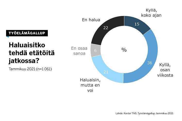 15 prosenttia työllisistä haluaisi tehdä jatkossa etätöitä koko ajan ja 36 prosenttia osan viikosta. 21 prosenttia haluaisi tehdä etätöitä, mutta ei voi.