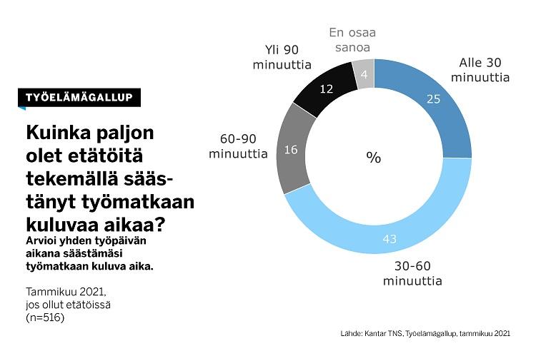Työmatka-aikaa säästyi etätyöntekijöillä keskimäärin noin 50 minuuttia vuorokaudessa, mikä tarkoittaa kansantalouden tasolla noin 2,75 miljoonaa vuorokautta.