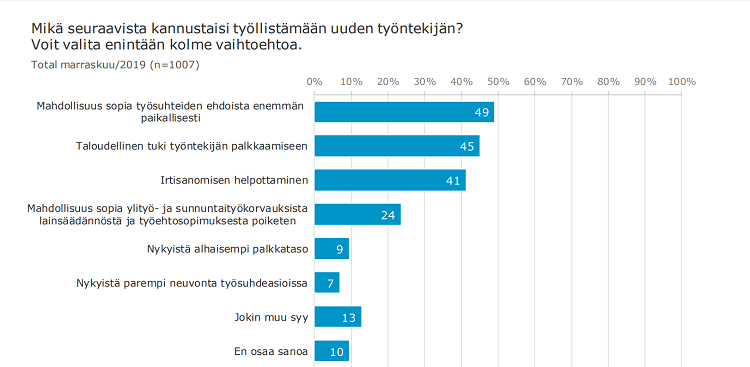 Kolmanneksi eniten työllistämiseen kannustaisi irtisanomisen helpottaminen (41 prosenttia vastaajista) ja neljänneksi mahdollisuus sopia ylityö- ja sunnuntaikorvauksista lainsäädännöstä ja työehtosopimuksista poiketen (26 prosenttia vastaajista). Yhdeksän prosenttia vastaajista kertoi, että nykyistä alhaisempi palkkataso rohkaisisi palkkaamaan.