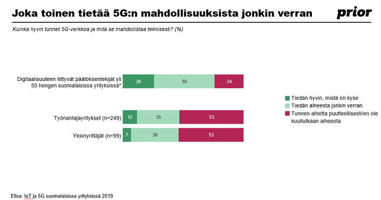 Neljäsosa kyselyyn vastanneista suomalaisista pk-yrityksistä arvioi, että tekoäly, automaatio tai 5G-teknologia voisivat olla uusien innovaatioiden vauhdittajia liiketoiminnalle. Lähes puolet aikookin arvioida jatkossa 5G-teknologian tarjoamia hyötyjä. Yli kolmasosa aikoo selvittää automaation ja tekoälyn kautta saatavia hyötyjä liiketoiminnalle.