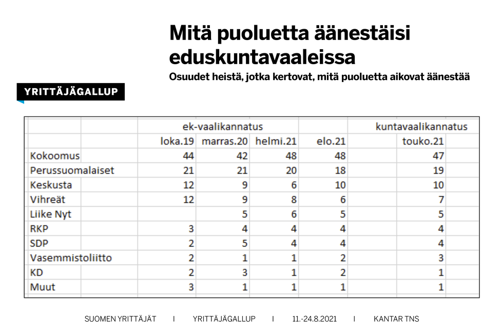 Kantar tutki yrittäjien puoluekannatuslukuja Yrittäjien toimeksiannosta. Tutkimuksessa haastateltiin 1040 yrittäjää tai yrityksen edustajaa. Virhemarginaali on +- 3,1 prosenttiyksikköä. Kyseessä ei ole Suomen Yrittäjien jäsentutkimus.
