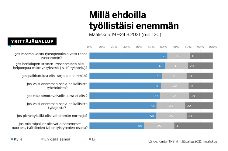 Kantarin Suomen Yrittäjien pyynnöstä tekemän Yrittäjägallupin mukaan yrittäjien mielestä tehokkainta olisi helpottaa määräaikaisten työsopimusten tekemistä (63 %) ja helpottaa henkilöperusteista irtisanomista alle 10 henkilön yrityksissä (61 %).