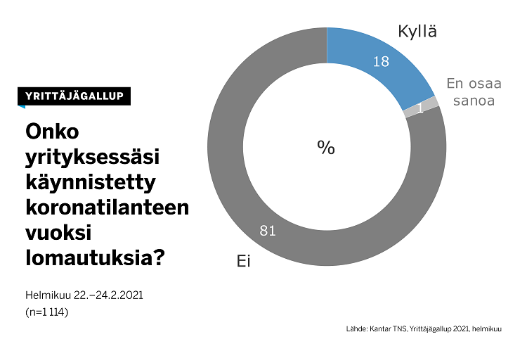 Lomautuksia on toteuttanut 18 prosenttia yrityksistä. Irtisanomisia kertoo aloittaneensa kuitenkin vain kuusi prosenttia yrittäjistä.