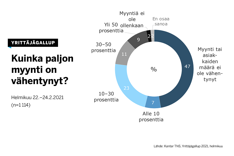 53 prosentilla yrityksistä myynti on vähentynyt, 22 prosentilla yli 30 prosenttia. Tilanne on parantunut syksystä hieman. Kantar kysyi Yrittäjien pyynnöstä yrittäjiltä koronakriisin vaikutuksista. Kyselyyn vastasi helmikuun lopulla 1114 yrittäjää.