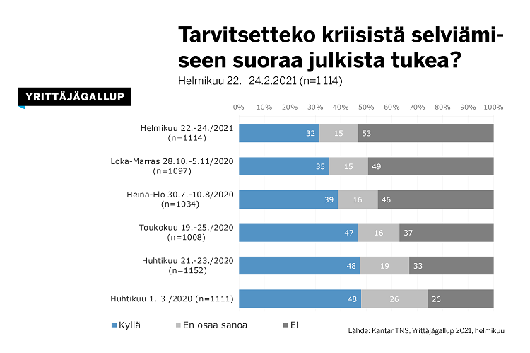 Suoraa julkista tukea kertoo tarvitsevansa 32 prosenttia vastaajista. Luku on pienentynyt syksystä hieman, mutta juuri alkanut sulkutila uhkaa muuttaa suuntaa.