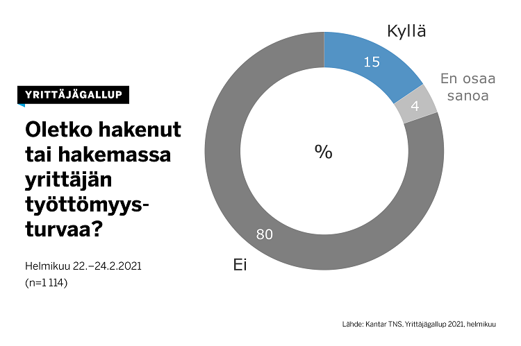 Yrittäjän työttömyysturvaa on hakenut 15 prosenttia vastaajista. Osuus on vaihdellut kriisin aikana 15 ja 22 prosentin välillä. Työttömyysturvan pidennys on paraikaa eduskunnan käsittelyssä.
