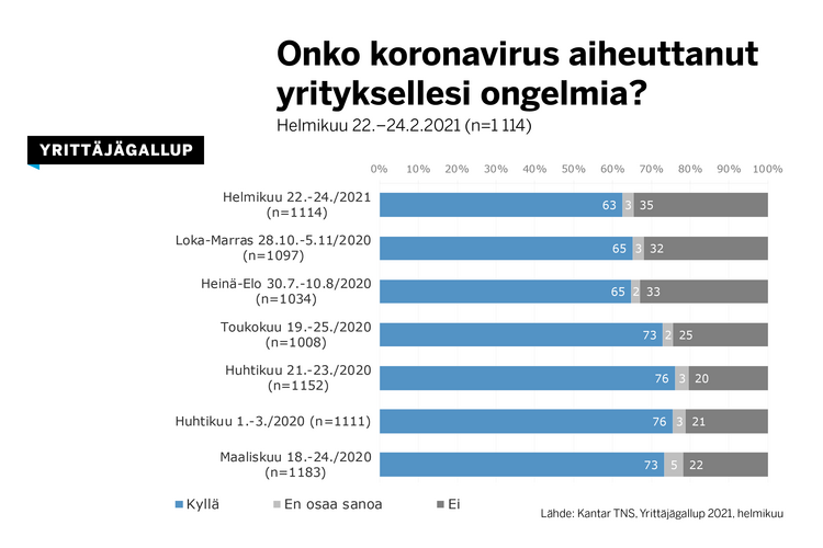 Edelleen 63 prosenttia yrittäjistä kertoo yrityksensä kärsivän koronakriisistä. Tilanne on parantunut syksystä vain vähän, Yrittäjägallup kertoo. Maksuvaikeuksissa on 13 prosenttia, lopettamista pohtii kymmenen prosenttia ja konkurssiuhkaa kokee viisi prosenttia. “Kiristyneet rajoitustoimet pahentavat tilannetta. Yritystukia ja lakimuutoksia tarvitaan nyt nopeasti”, toimitusjohtaja Mikael Pentikäinen Suomen Yrittäjistä sanoo.