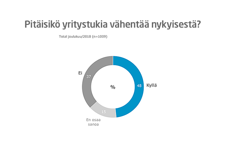 Asiaa on kysytty nyt myös suoraan pk-yrittäjiltä. Tukia pitää vähentää nykyisestä, vastasi 48 prosenttia tuoreeseen Yrittäjägallupiin vastanneista yrittäjistä. 37 prosenttia vastaajista ei vähentäisi tukia ja 15 prosenttia ei osannut sanoa. Yrittäjägallupin teki Kantar TNS Suomen Yrittäjien pyynnöstä. Kyselyyn vastasi 1009 yrittäjää.