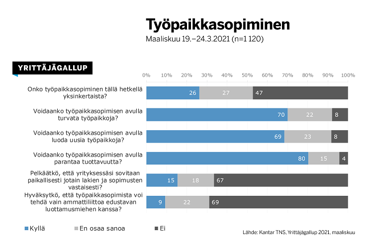 Yrittäjät uskovat vahvasti, että paikallisella sopimisella voidaan parantaa tuottavuutta (80 %), turvata työpaikkoja (70 %) ja luoda uusia työpaikkoja (69 %).