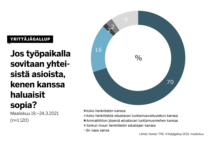 – Tutkimus osoittaa, että yrityksissä halutaan sopia eniten koko henkilöstön kanssa. Isoissa yrityksissä myös koko henkilöstöä edustava luottamusvaltuutettu nousee vahvaan rooliin, toimitusjohtaja Mikael Pentikäinen Suomen Yrittäjistä kommentoi.