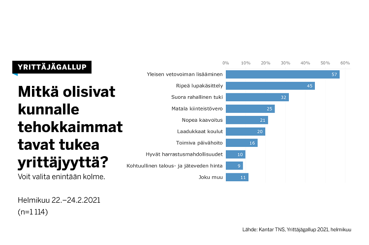 Kuntavaalivuonna on olennaista keskustella kuntien tavoista tukea yrittäjyyttä. Kantar kysyi asiasta yrittäjiltä Yrittäjägallupilla, johon vastasi 1114 yrittäjää. Yrittäjien selkeä suosikki on kunnan yleisen vetovoiman lisääminen (57 %). Kysymykseen sai valita useamman vaihtoehdon.
